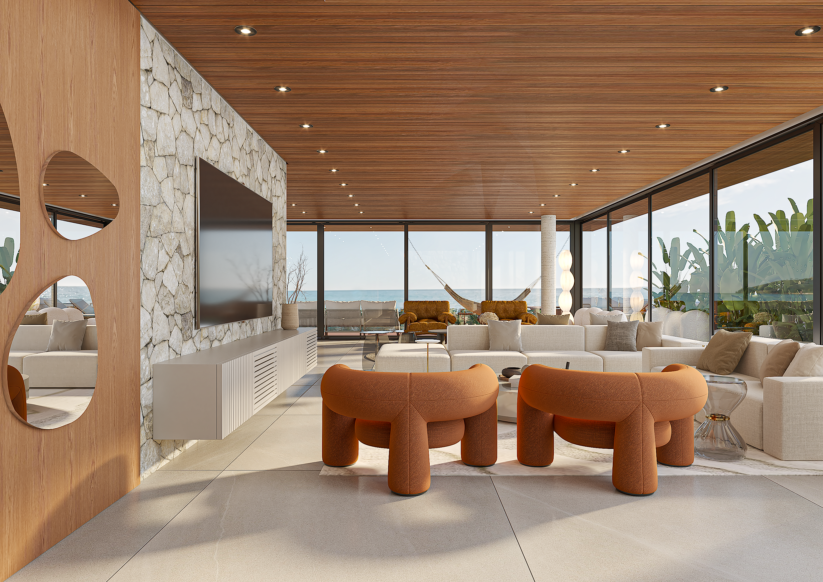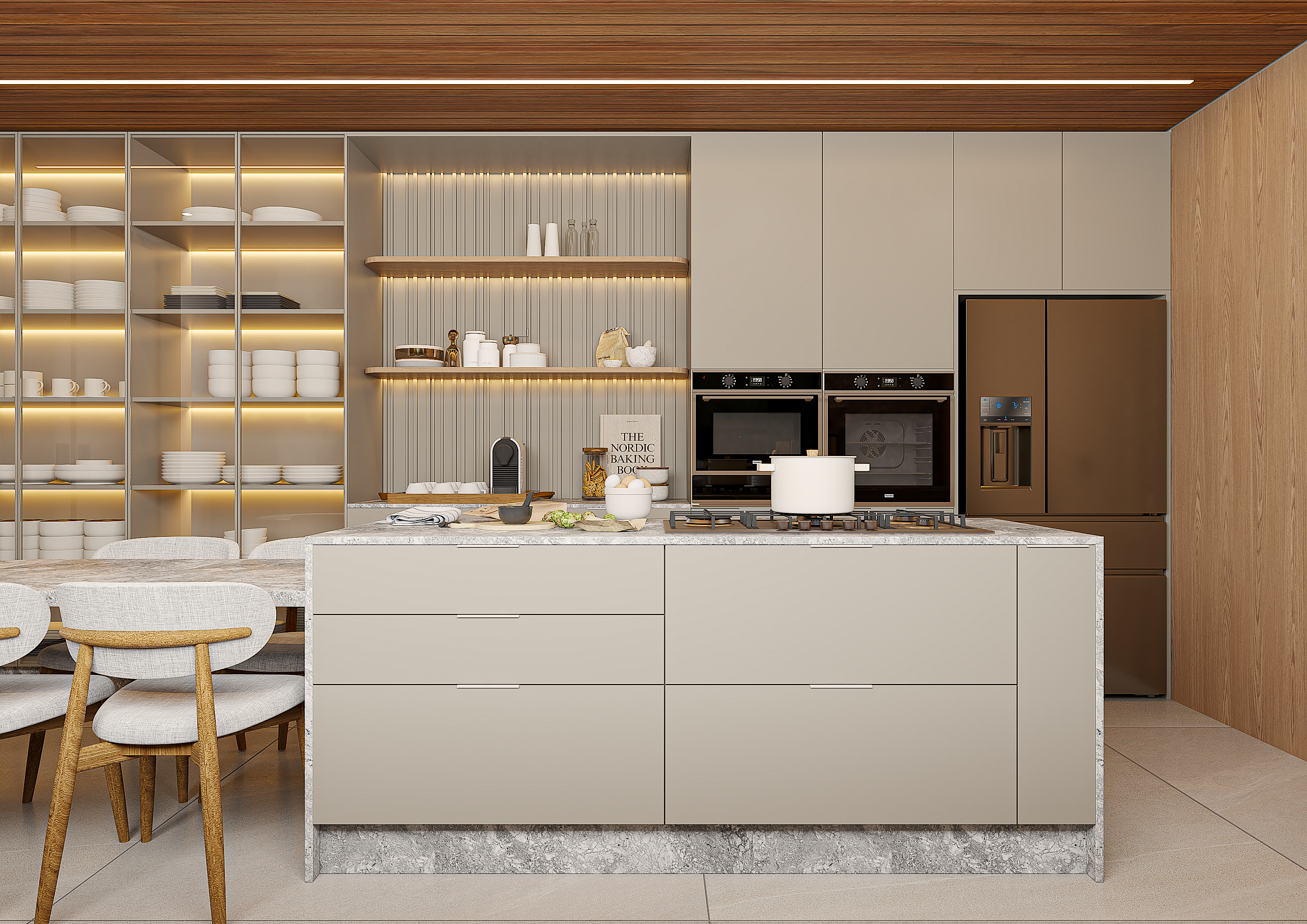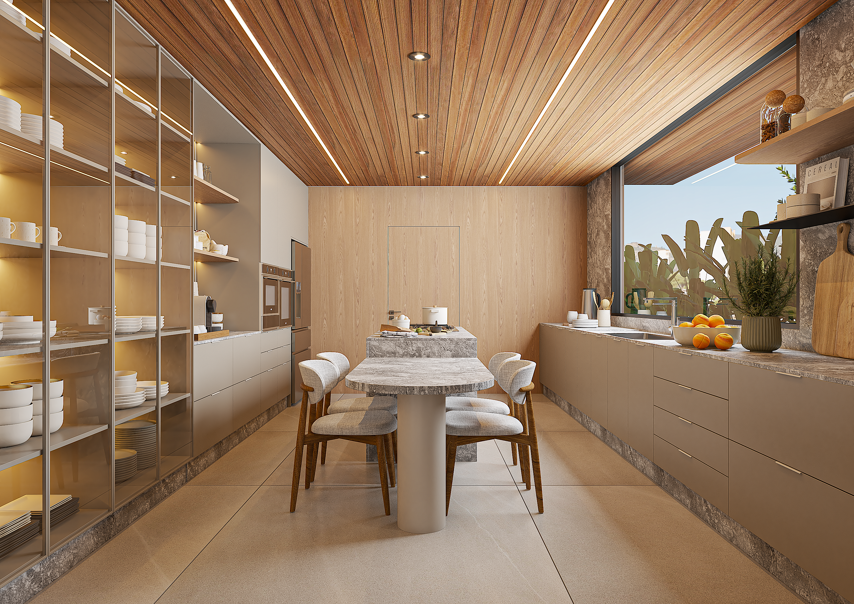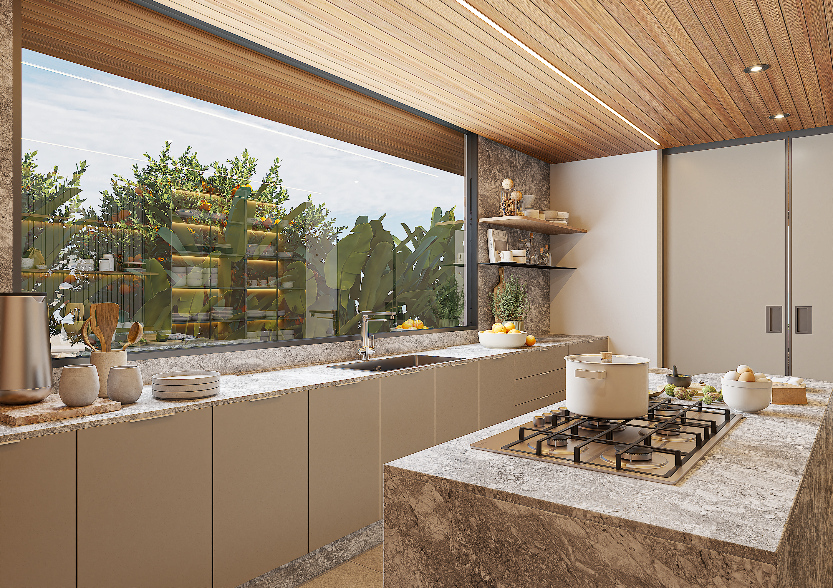 Os produtos Todeschini, explorados em painéis, portas, prateleiras, modulações, frentes e espelhos, reforçam a sofisticação e a versatilidade do espaço. Inspirado na arquitetura contemporânea brasileira, o projeto valoriza materiais naturais e atemporais.
