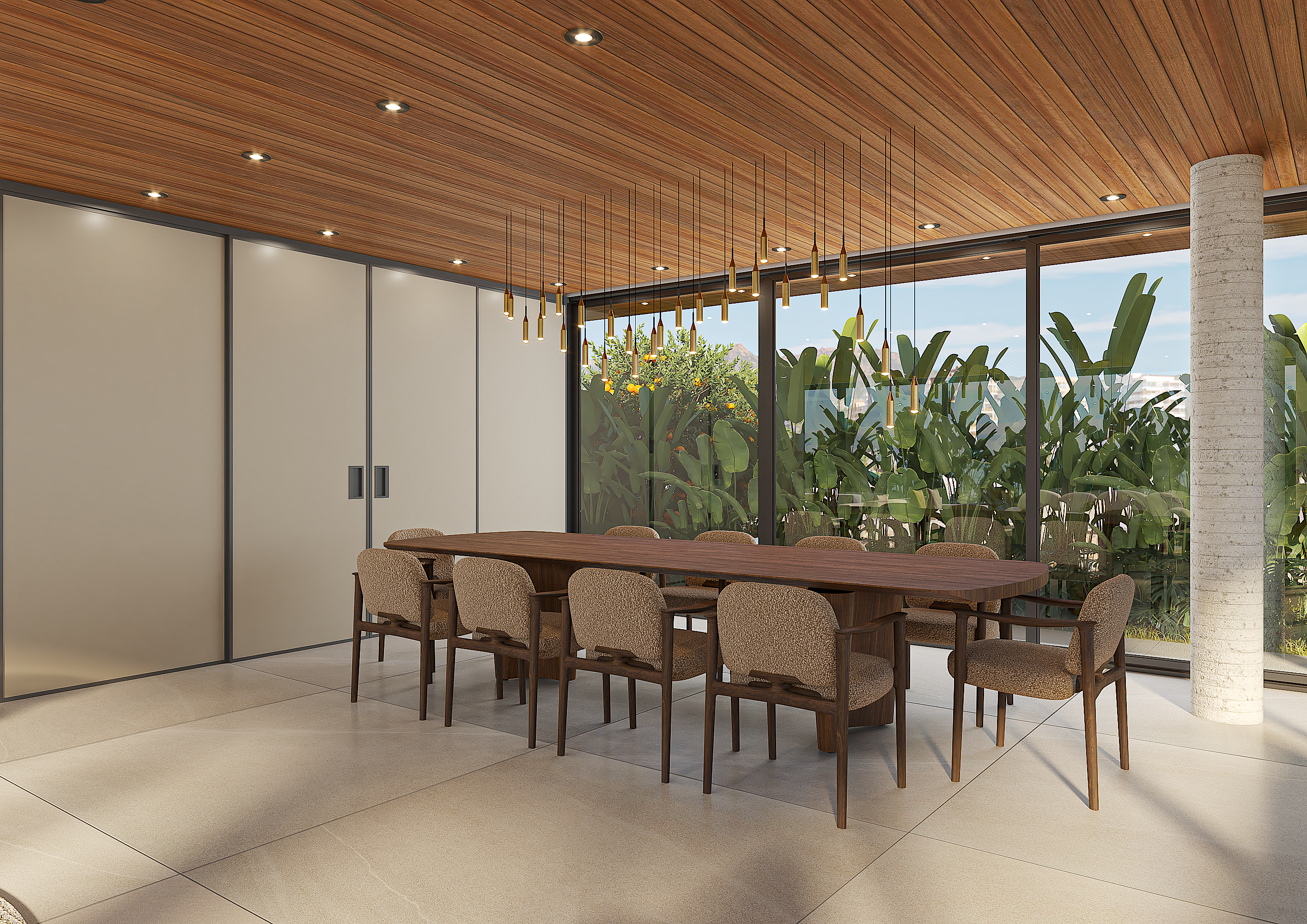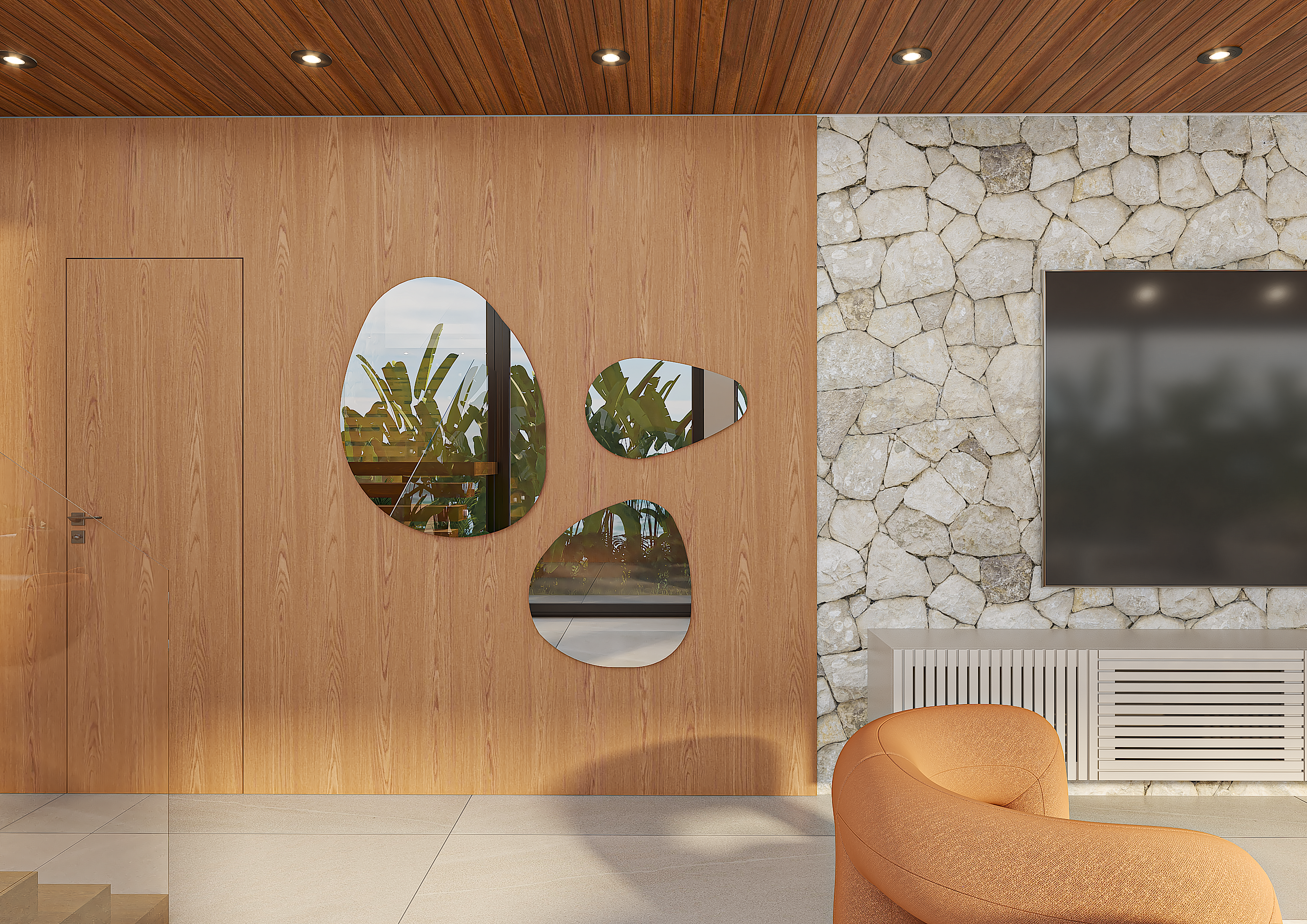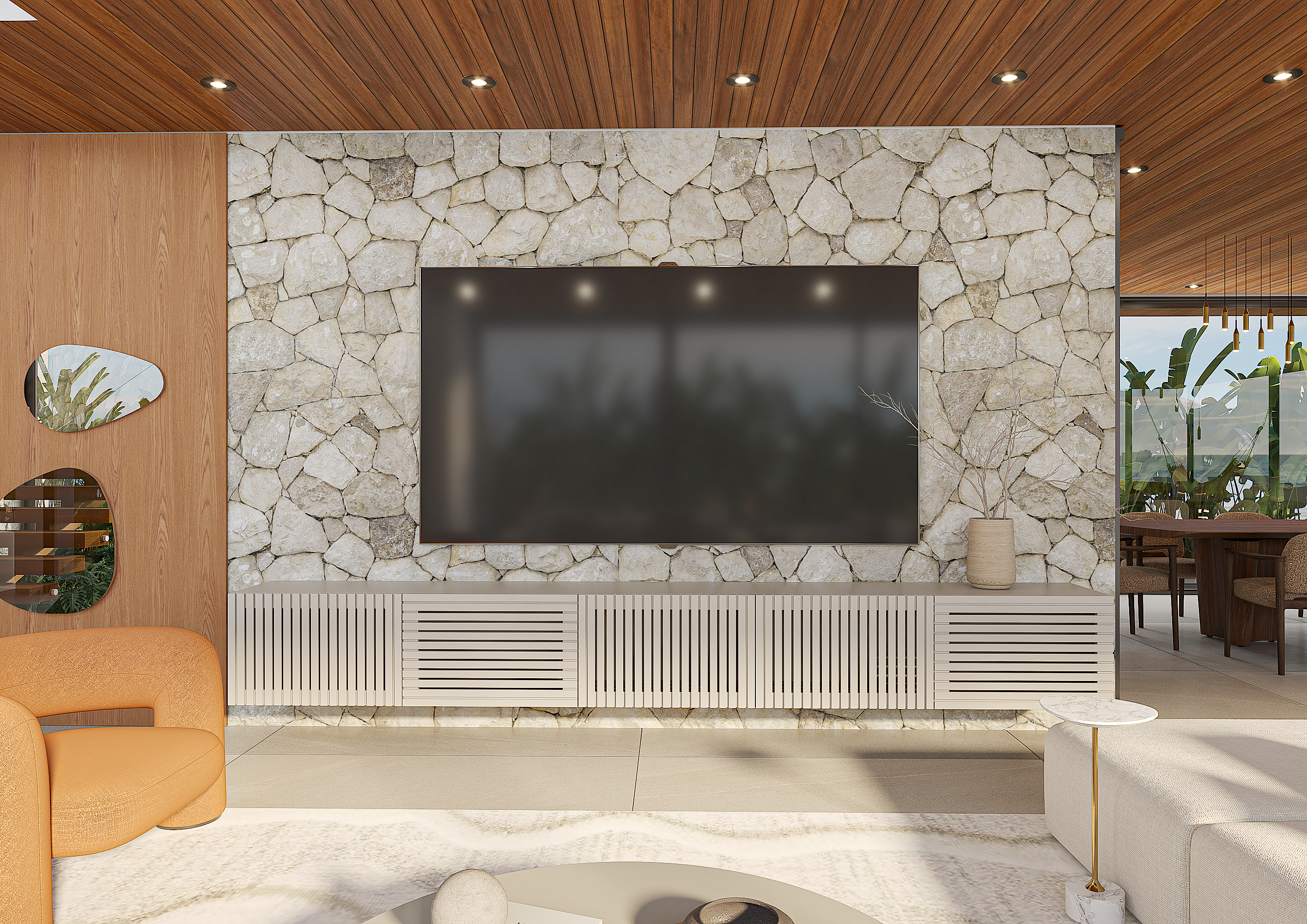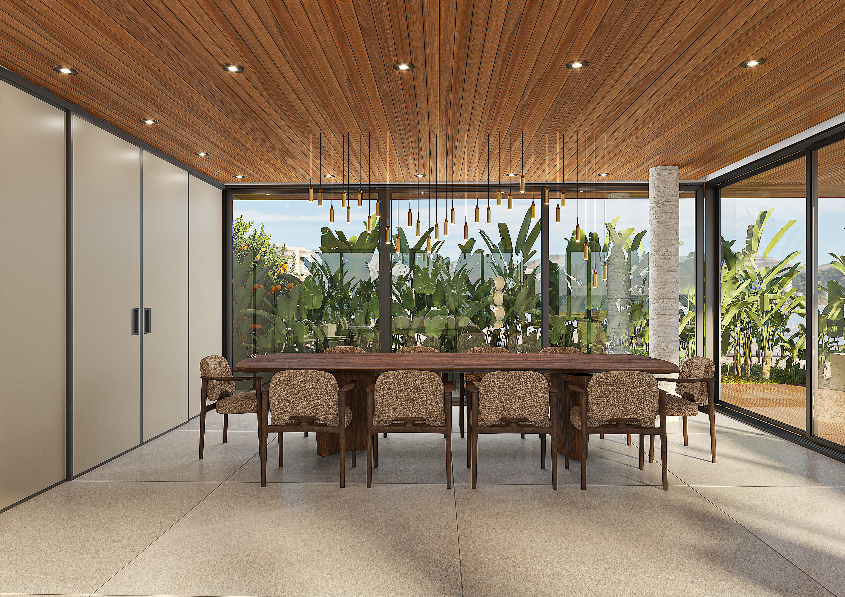 Os produtos Todeschini, explorados em painéis, portas, prateleiras, modulações, frentes e espelhos, reforçam a sofisticação e a versatilidade do espaço. Inspirado na arquitetura contemporânea brasileira, o projeto valoriza materiais naturais e atemporais.